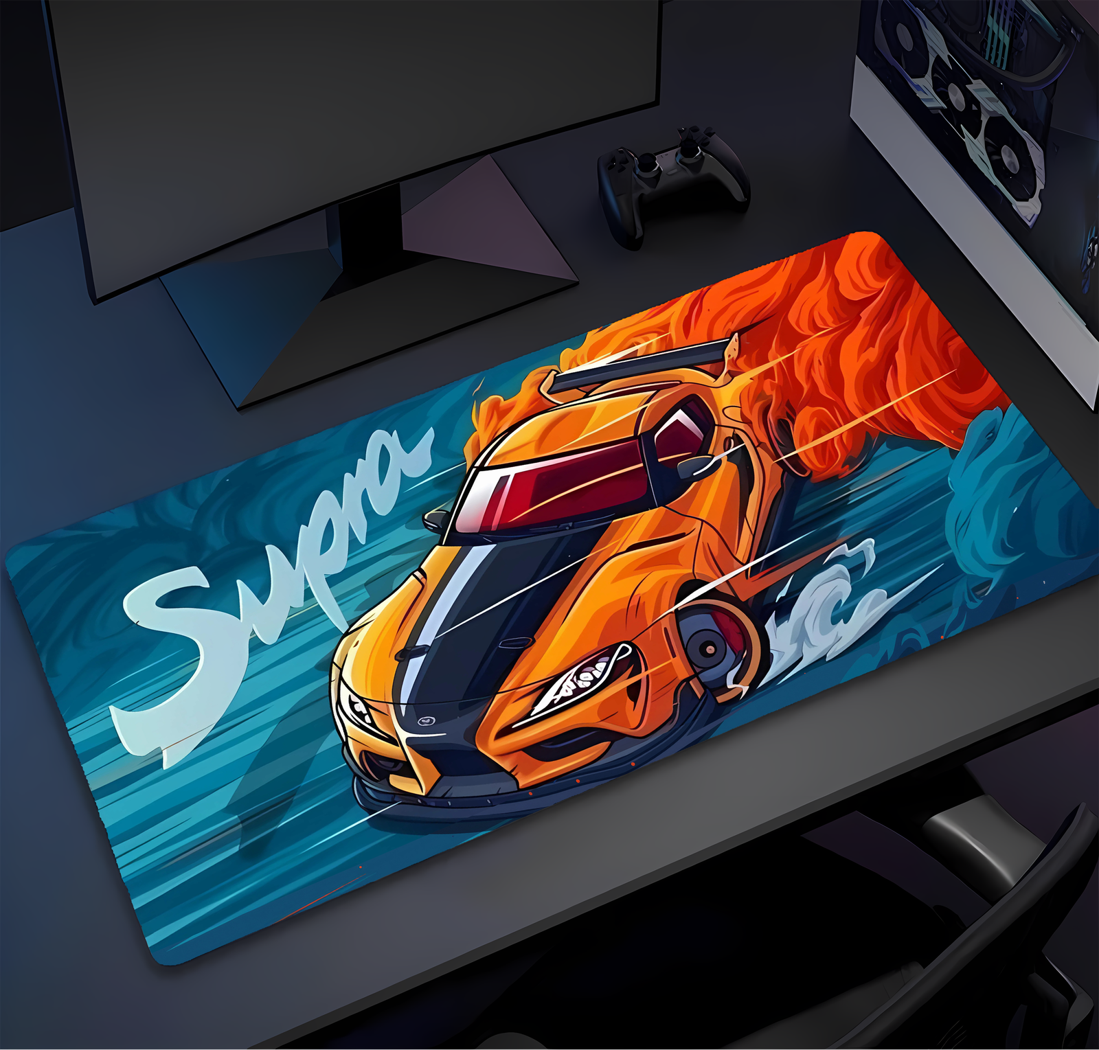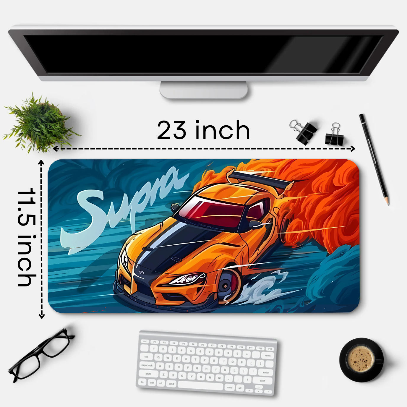 Add speed, style, and power to your workspace with this Supra Car Gaming Mouse Pad. Designed for gamers, car lovers, and professionals alike, this extra-large desk mat (23 x 11.5 inches) offers ample space for your keyboard, mouse, and accessories. Featuring a stunning Supra sports car drifting through vibrant flames, it delivers a bold and energetic vibe to your setup.