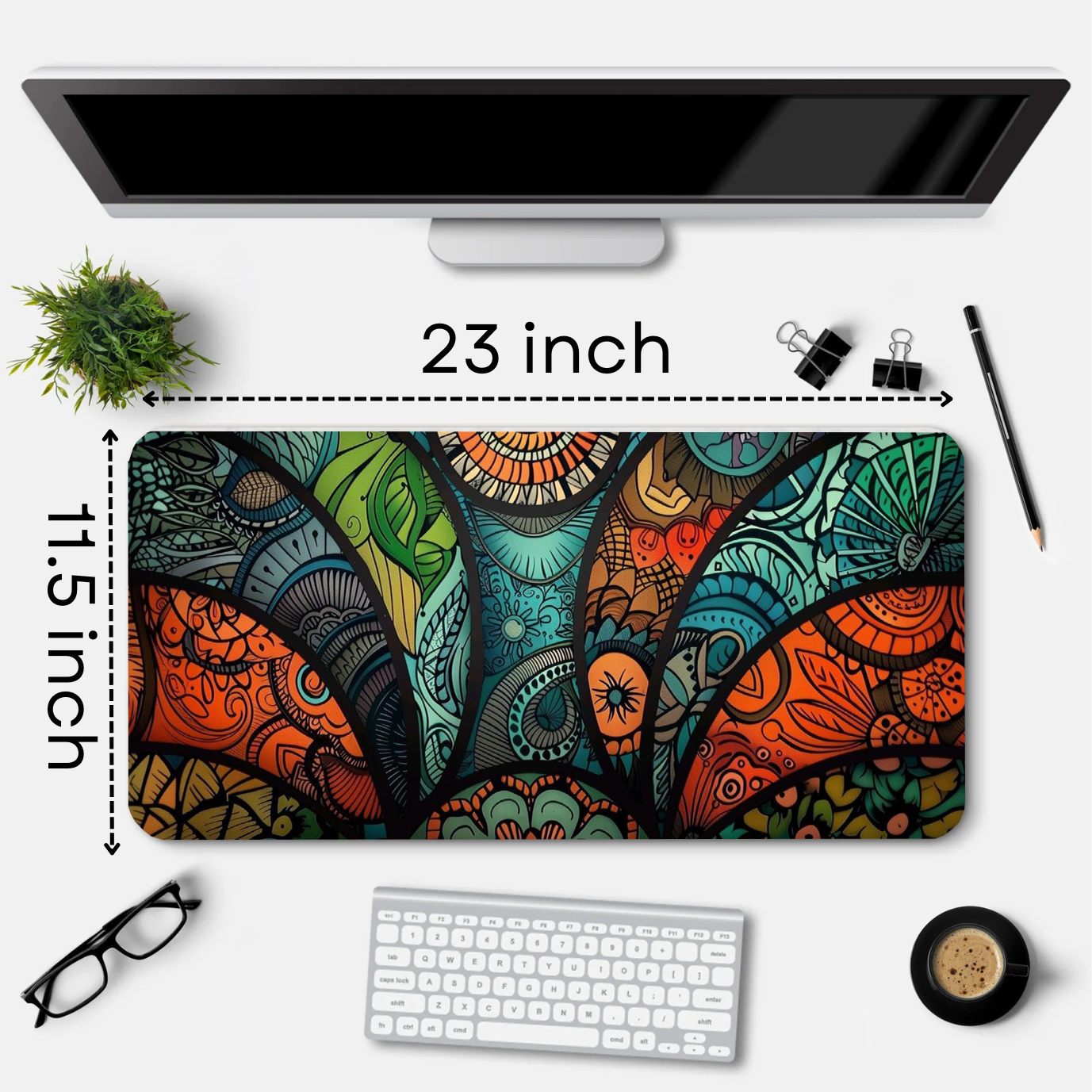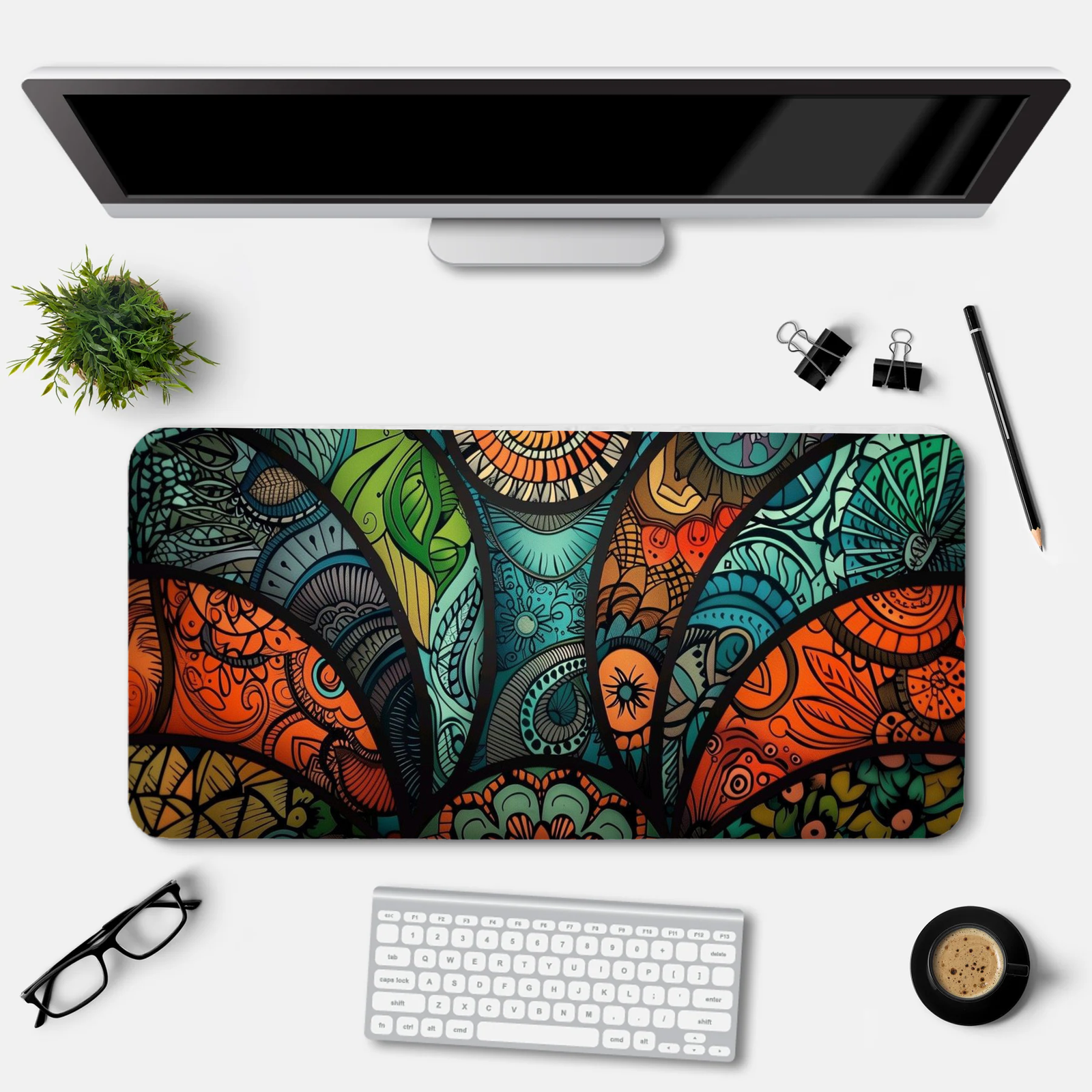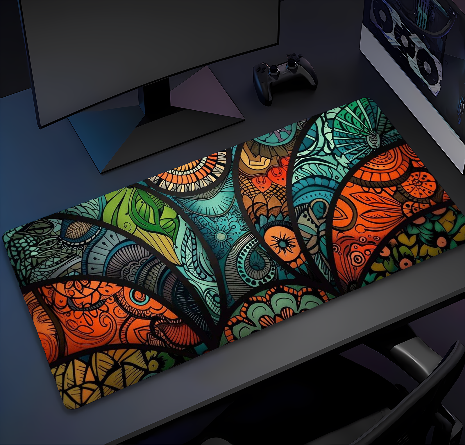 Breathe life and color into your workspace with our stunning Vibrant Mandala Art Mouse Pad. This extra-large mouse pad is a functional piece of art, featuring a mesmerizing, intricate abstract and mandala-style pattern bursting with shades of orange, teal, green, and deep blue.